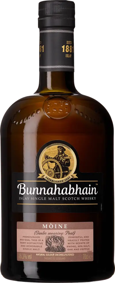 Mòine skiljer sig tydligt från Bunnahabhains övriga buteljeringar genom sin markerade rökighet. Röken kommer från lokal torv som används vid torkningen av malten, vilket ger en karaktär som är både jordig och maritim snarare än tung och sotig. Färgen är ljust halmgul, klar och inbjudande. Doften öppnar med elegant torvrök och tydlig fatkaraktär. Under röken ligger fruktiga toner av päron och friska äpplen som ger struktur och balans. Havets närvaro är påtaglig – en lätt sälta och associationer till ostronskal förstärker det kustnära uttrycket. Ljunghonung, tjära och vanilj från faten vävs samman med frisk citrus i en fyllig och nyanserad arombild. Smaken är kraftfull men kontrollerad, med tydlig fatprägel och inslag av tjära, salmiak, örter och grapefrukt. Texturen är tät och oljig utan att bli tung. Avslutet är långt, rökigt och komplext, där sötma, sälta och bitterhet klingar av i harmonisk balans. En rökig whisky med tydlig identitet och en av de stora favoriterna på den svenska marknaden.